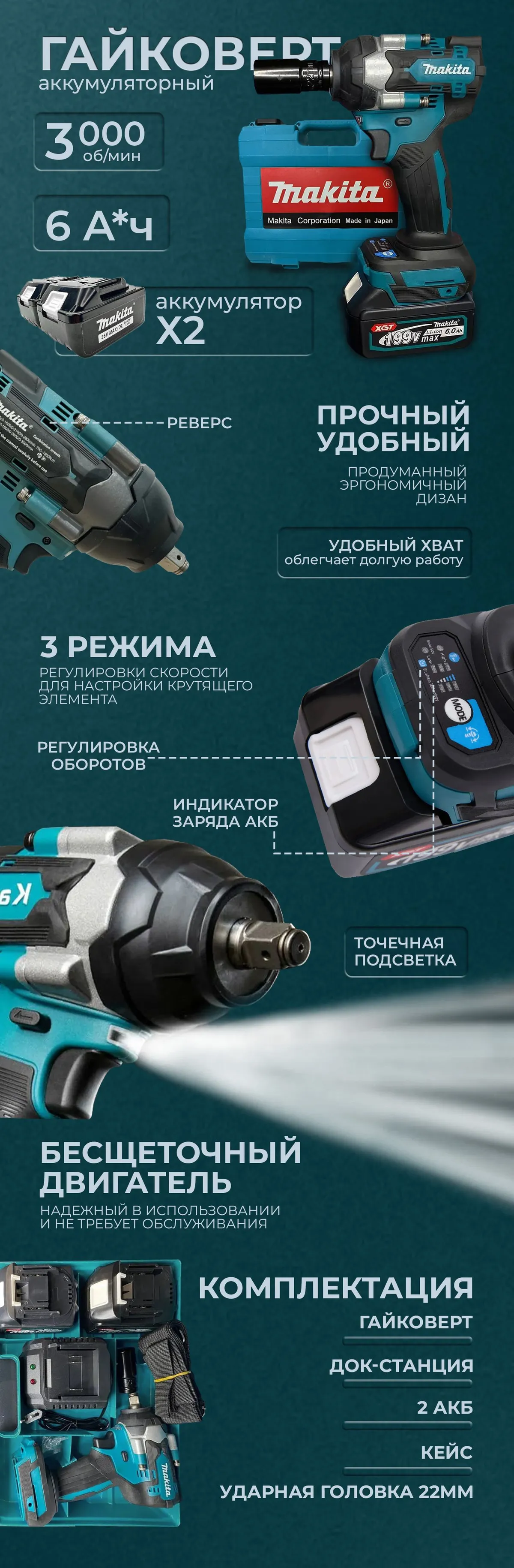 Гайковерт аккумуляторный 1200Н.м • Два усиленных АКБ с емкостью 6.0Ач •Противоударный кейс • Зарядное устройство(Док-станция) Док-станция обеспечивает быструю зарядку аккумуляторов, что позволяет быстро вернуться к работе.