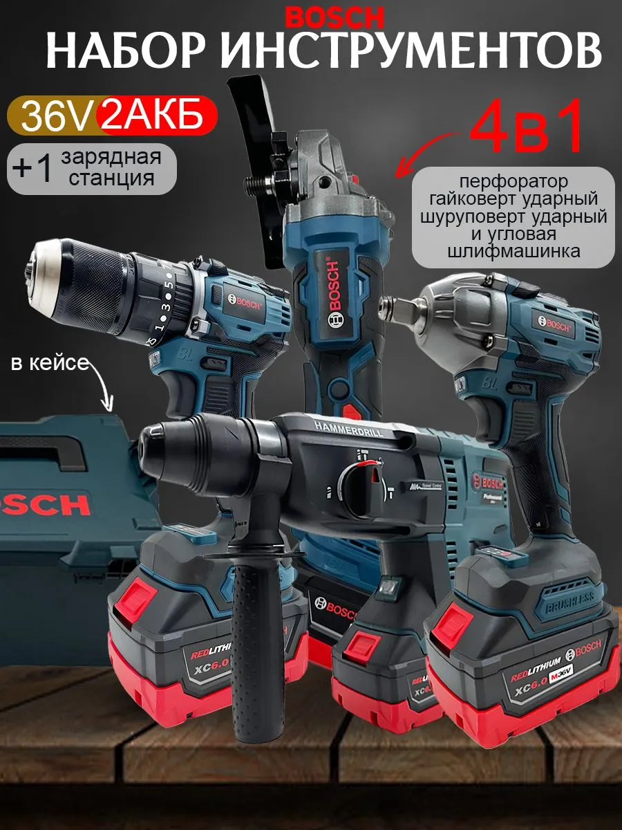 В комплектацию Набора электроинструментов аккумуляторных Bosch 4в1 36V /болгарка, гайковерт, перфоратор, дрель шуруповерт входят: - Аккумуляторная угловая шлифовальная машина "Болгарка" (1шт); - Аккумуляторный гайковерт (1шт); - Аккумуляторный шуруповерт (1шт); - Аккумуляторный перфоратор (1шт); - Аккумуляторы (2шт); - Зарядная станция (1шт); - Защитный кожух (1шт); - Рукоятка (2шт);