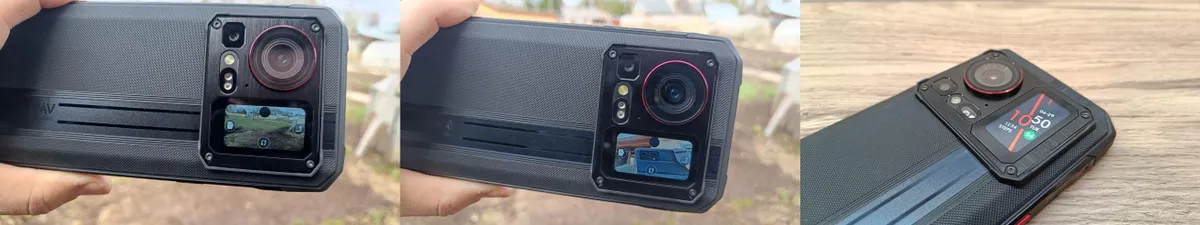 А вот с тыльной стороны не совсем стандартное размещение элементов. Здесь добавился небольшой цветной сенсорный экран, дополнительные инфракрасные светодиоды для активации ночного режима. При этом все элементы все также вынесены на небольшую возвышенность. Тыльная часть смартфона имеет дополнительную рифленую поверхность, которая, в свою очередь, упрощает момент удержания смартфона в руке.