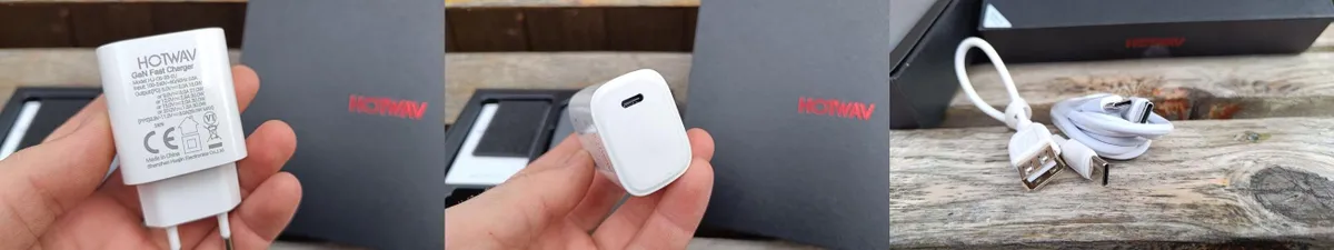 Для заряда аккумулятора смартфона предусмотрен сетевой блок питания мощностью в 33 Вт. Не шибко быстро для аккумулятора в 6280 mAh, но уже шаг вперед. Обычно Hotwav оснащает свои гаджеты зарядками до 20 Вт, а если учитывать, что смартфоны имеют увеличенный размер аккумулятора, то заряд затягивается на некоторое время. Зарядное устройство рассчитано на широкий диапазон напряжений. Комплектный провод подключается к разъему USB Type-C. Сам провод зарядки длиной около метра, кроме него присутствует еще и кабель USB OTG. Да, в смартфоне реализована возможность обратной зарядки гаджетов. Все провода в комплекте, подключаемся и заряжаем. А в случае необходимости и флешку можно зацепить для просмотра картинок или видео на экране смартфона.