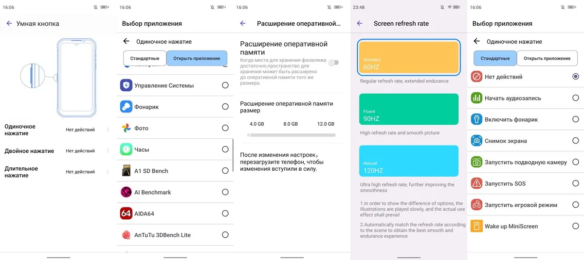 Кроме того, есть возможность настройки функциональной кнопки, которая находится с левого торца смартфона. Для запуска выбранной функции придется использовать однократные или множественные нажатия. Довольно интересная кнопка, позволяющая быстрый запуск необходимых функций.