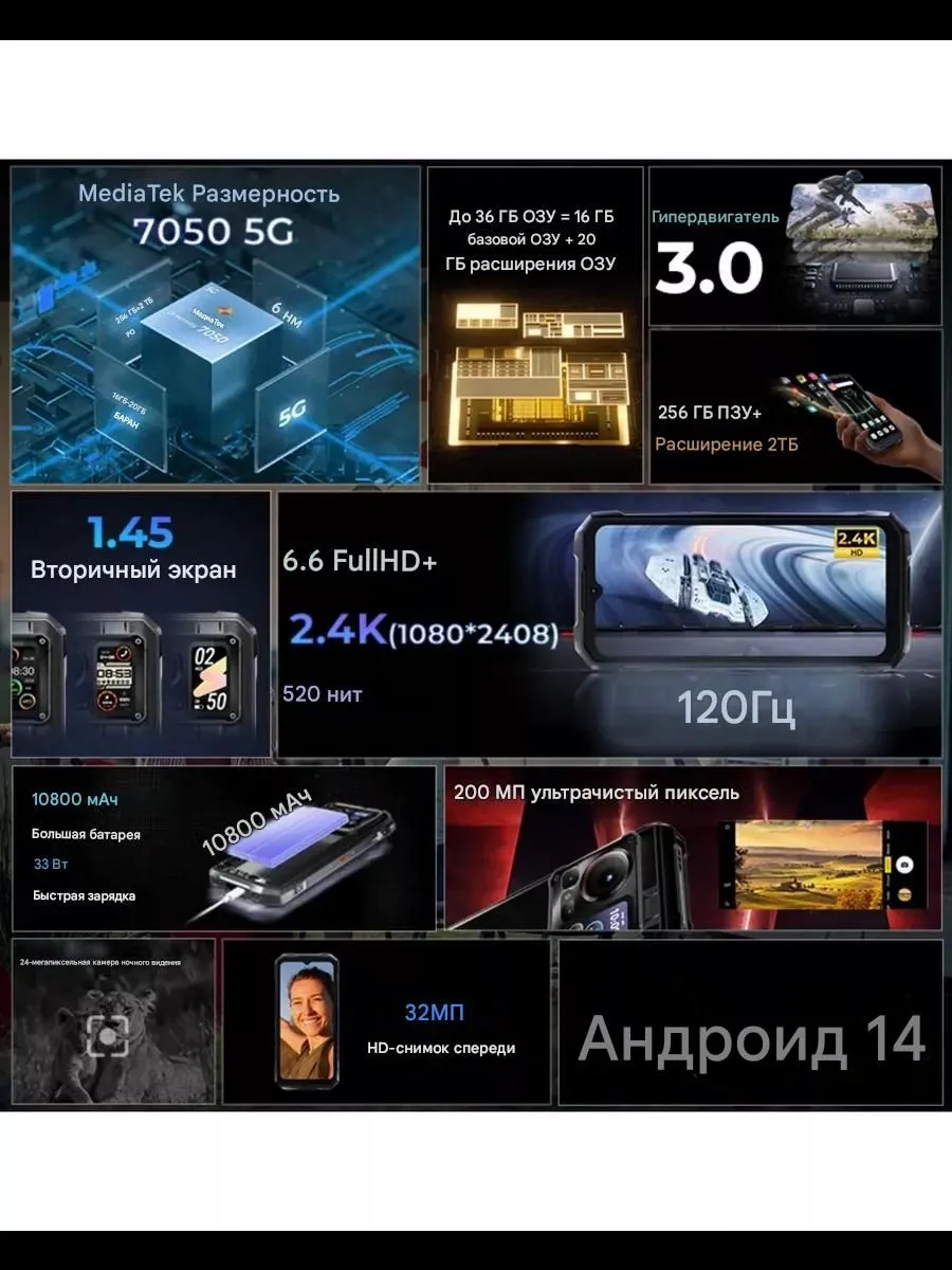 Компания Hotwav официально представила свою очередную новинку в защищенном корпусе. Кроме того, Hyper 7 Pro оснащается функциональным вторым экраном, на котором можно узнать время, сторону света (цифровой компас), запустить музыку и управлять камерой. В смартфоне используется довольно свежий процессор MediaTek Dimensity 7050 5G, неплохой набор по памяти, а также камера на 200 Мп с возможностью ночной съемки. Емкий аккумулятор на 10800 mAh с поддержкой быстрой зарядки на 33 Вт и современный Android 14. Щупаем, тестируем, проверяем.